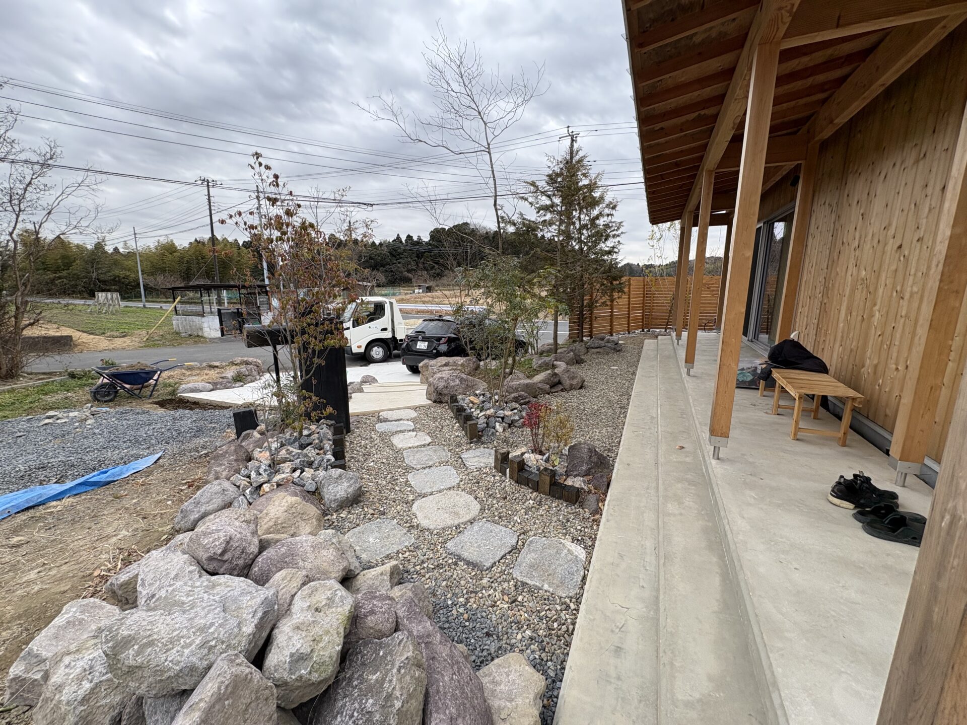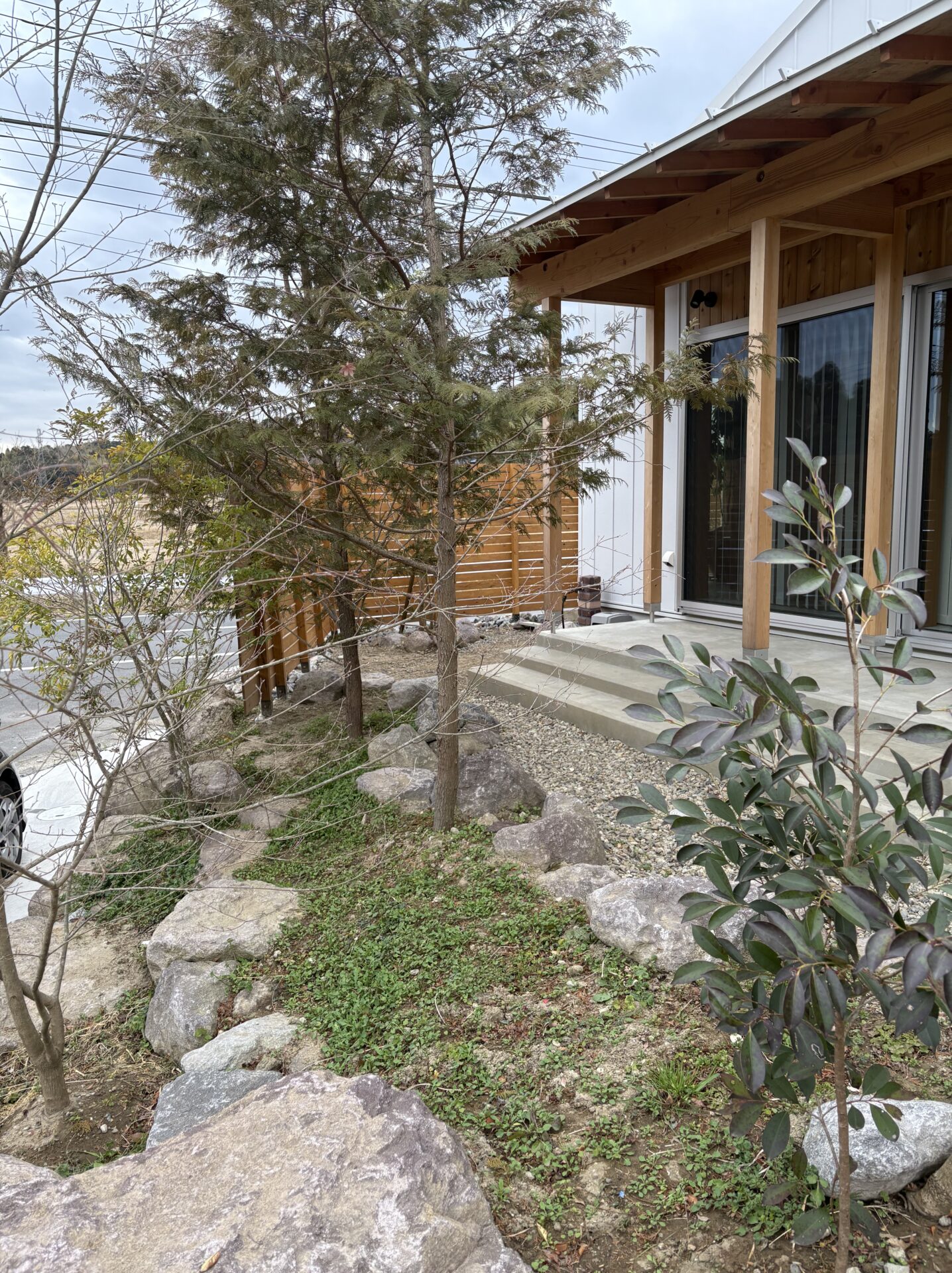 石積み、植栽、駐車場土間打ちを含む造園外構の工事の施工例が完成しました。
