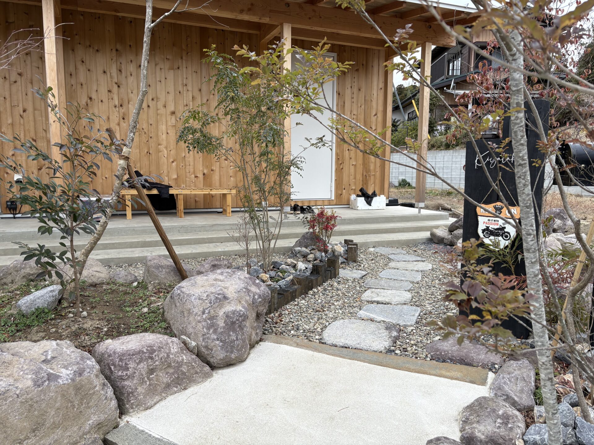 石、木、土間による造園外構が造る景色